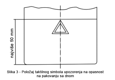 Na tubama i ampulama, taktilni simbol upozorenja mora biti postavljen na ramenu, ravnomerno razmaknut oko mlaznice tube, i to na sledeci nacin: Tacke i trouglovi se postavljaju u koncentricni krug oko mlaznice tube; one se ravnomerno rasporedjuju (povrsina sa trouglom koja je pracena glatkom povrsinom), svaki trougao mora imati tacku na spoljasnjoj ivici tube (usmeren prema spoljasnjoj strani tube) (videti primer na slici 4). Na drugim pakovanjima bez dna, taktilni simbol upozorenja mora biti postavljen na povrsini za rukovanje po odluci proizvodjaca.